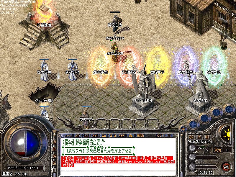 【系统】:欢迎进入2011超变合击【<$SERVERNAME>】,本版本由【gm7d工作室】独家荣誉出品,长期运行开放!版本全面采用最新反外挂列表,警告那些使用非法外挂的玩家!禁止使用任何游戏辅助工具,变态外挂、加速器等,一旦发现永久冻结相关角色!敬请爱护游戏环境,捣乱的直接封IP....