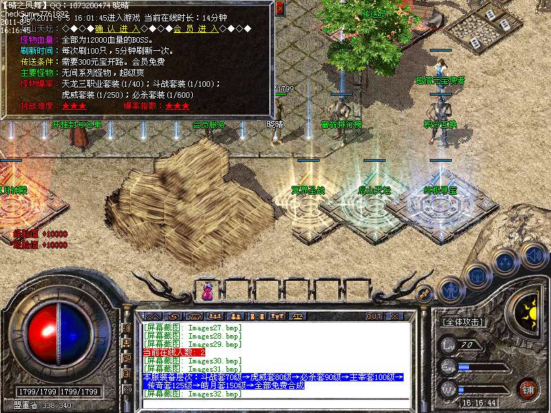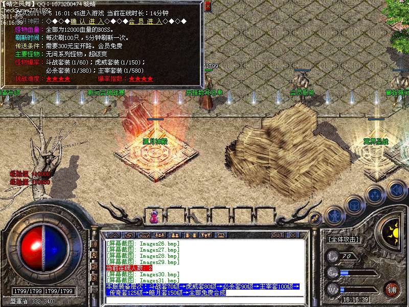 【3.技能爆率】:彻地钉.擒龙手.开天斩.逐日剑法.龙影剑法.流星火雨.群体雷电术.火龙之息.噬血术 .飓风破.群体施毒术.无机真气.无机真气.狮子吼.灭天火|B00S 均能爆到,助你PK更牛B