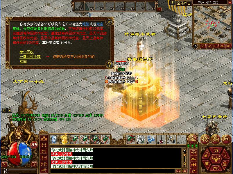 中级玩家在新手打宝区5层打到蟠龙装备后,可直接去天界打圣王精魄融合为圣天上品,不要急着带,用一块精炼石就可以转换为炙炎装备