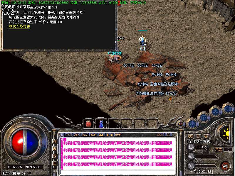 新手上线建议:猪洞7层 所爆物品:沃玛装备、金币,声望.祖玛7层 爆祖玛套装(新人打宝地)BOSS:魔龙教主、暗之魔龙教主 所爆物品:雷霆、逍遥、开天级武器