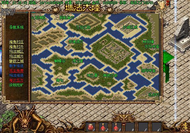 地下皇陵:新手村最小的那个神秘岛(点开传送员可以看到),在岛上有塔林,中间最大的宝塔那进,坐标:377 364,随即飞去或带传送飞去,爆本F顶级装备,爆率一般。(所以在此说明一点,拥有了传送就可以拥有顶级装备)