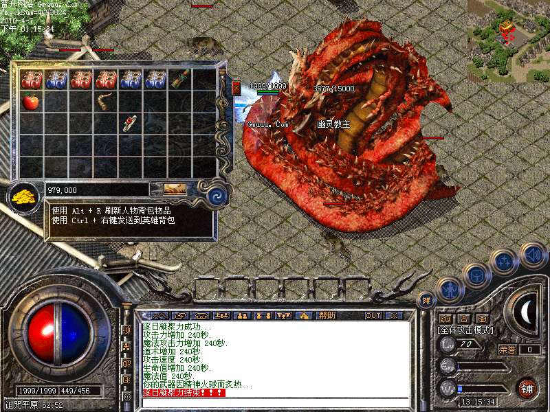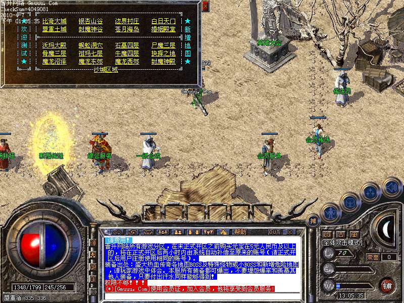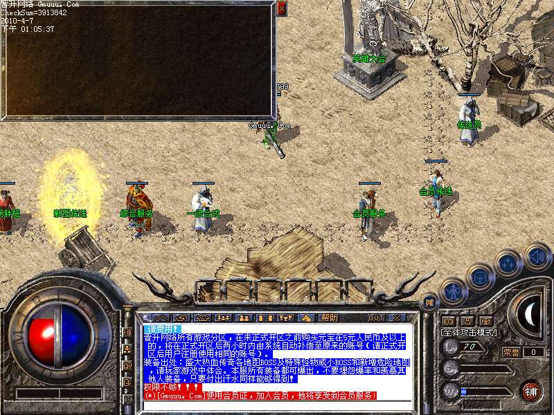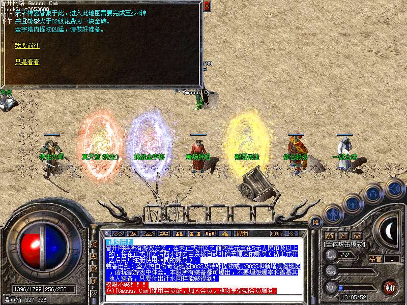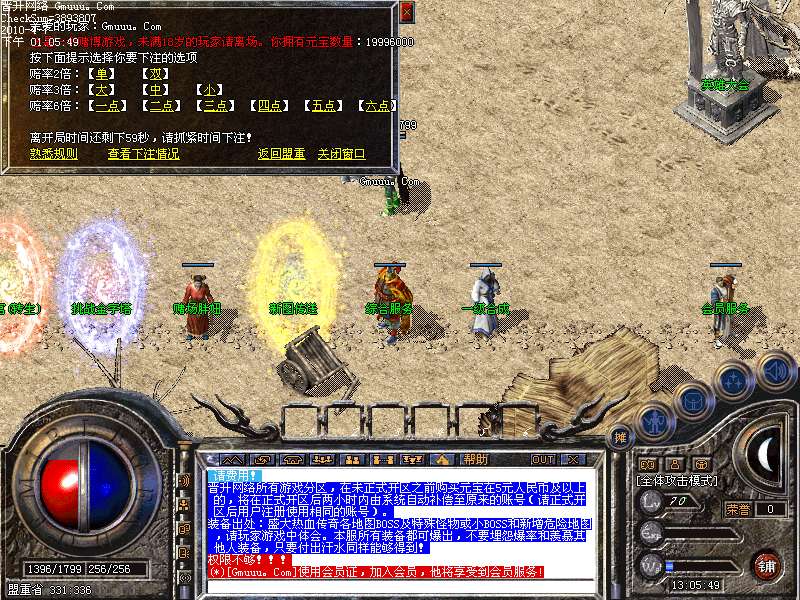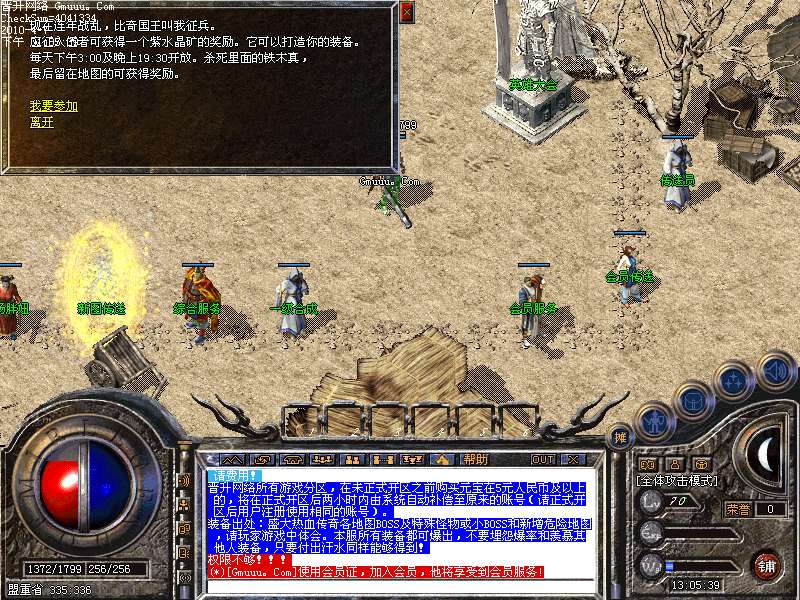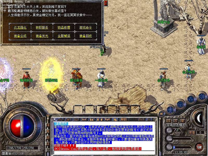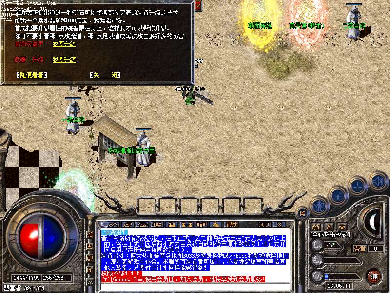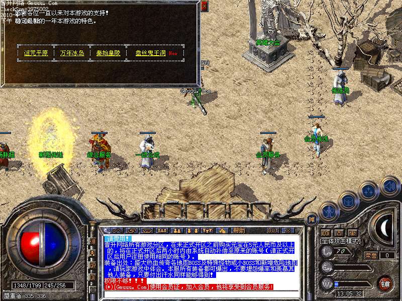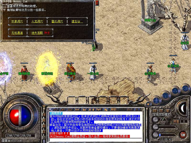 [版本特色15]紫水晶矿由盛大各地图BOSS爆出。游戏在线命令:"@服务",不用回程一样买药,买双倍经验,全服喊话等,在任何地图不用NPC也能执行一些操作。沙巴克成员可在沙巴克NPC处传送至沙巴克藏宝阁。
