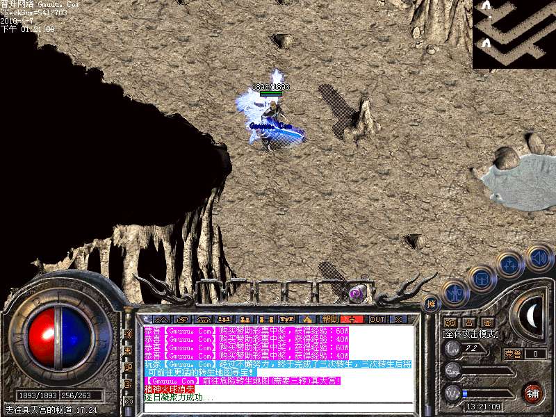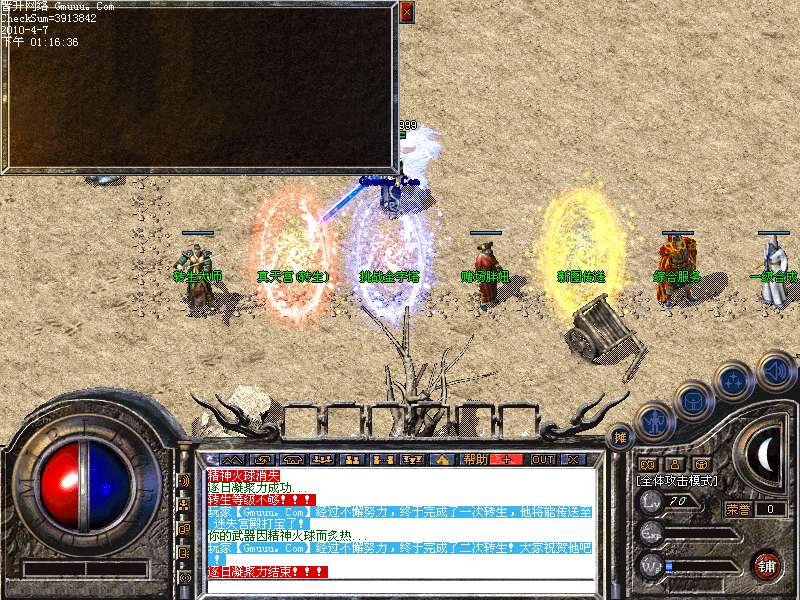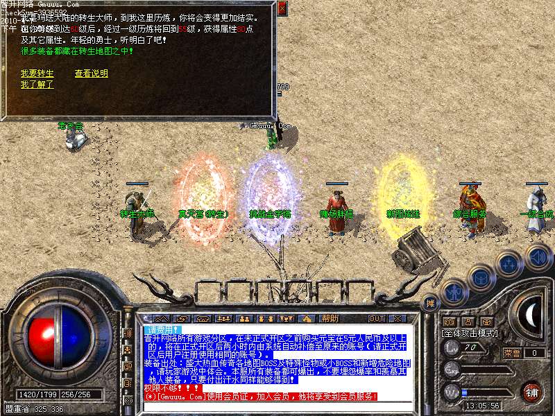 [版本特色13]在转生员处可进行转生,转生不降等级,一转后可去迷失宫殿及遗忘谷,三转后可去真天宫及无忧圣地等。每次转生可获得80点属性点!