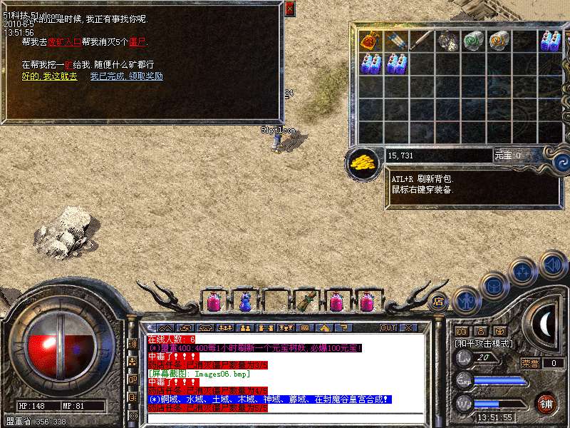 (*)重不归路可以进入僻世森林,神奇之地可以进入绝望和地下魔宫都是出46级以上装备的地方,土右上的西方游客可以进入麒麟洞和地狱之牢可以打出49以上装备。