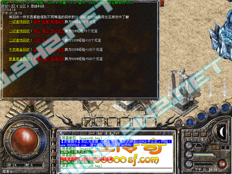 六.【特殊刷新】用魔法神石在土药旁边的魔法结阵可召唤出蚩尤.使用魔法神石召唤的同时可获得丰富的奖品.包括炎龙刃 致命2套装卷 傲皇首饰及武士神石 合成仙丹