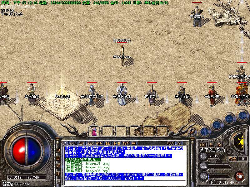 〖公告〗:非RMB得散人玩家注意了:你们可以去特殊地图打暗之怪物,可爆元宝,一般都是一个爆50,也会爆些逆火装备可以回收。有了300元宝就可以去雪域地图打逆火级和王者级装备,多的可以回收,在高级回收员那里,逆火5、王者20、金牛80并且有大量的经验哟。