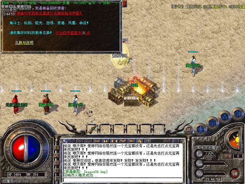 [财神显灵]每晚7点,财神会收购巴厘岛城内婷摊玩家卖的物品,财神带有5000元宝,所有你物品所标的价格不能高于5000元宝,只要婷摊的名称是:男角色“哥玩的不是传奇,是寂寞” 女角色“姐玩的不是传奇,是空虚”都有可能被财神收购!