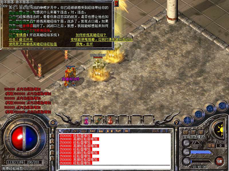 修炼英雄经络经验可以在土城【闭关修炼】进入[经验内功英雄经络三修房间]使用元宝修炼英雄经络经验