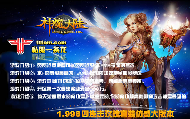 游戏介绍②: 本F的等级最高为130级,增加内功技能全部免费送-[到了等级送].终极装备是倚天荣耀装备可在本F终极地图(荣耀之地和荣耀之城)直接暴出或者用封神装备合成,里面的怪物为人型怪,穿什么就暴什么,无比凶猛!建议组队前往!荣耀套装备带有暗藏属性!特别是倚天武器,想知道什么样可以带上试试