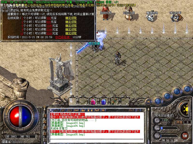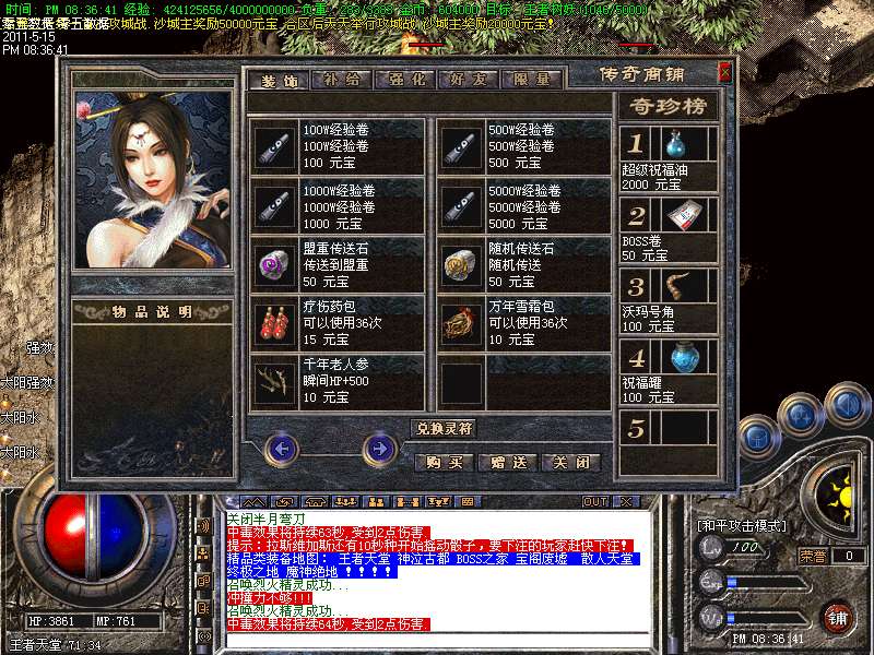②:行会争霸:每天下午18点,土城左上角点功城公告牌进入,获胜行会"奖励"元宝!③