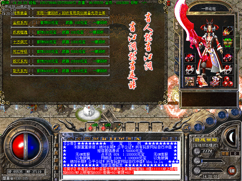 到土城泡点.点击NPC开始泡点.得到血祭套后.再领取一直年兽就可以去免费地图『极限寻宝』.『水上世界』打怪寻宝了,大怪小怪都可以轻松打到毁灭装备,元宝轻轻松松由此回收而来!这个是基本的新手路线! !