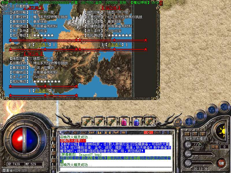 一.【地图介绍】:练级地图为疯狂练级、恶魔广场,石墓、生死之间、幻境三层、霸者大厅、尸魔三层.特别自助刷怪地图恶魔广场为5倍经验三倍经验石可实现15倍经验
