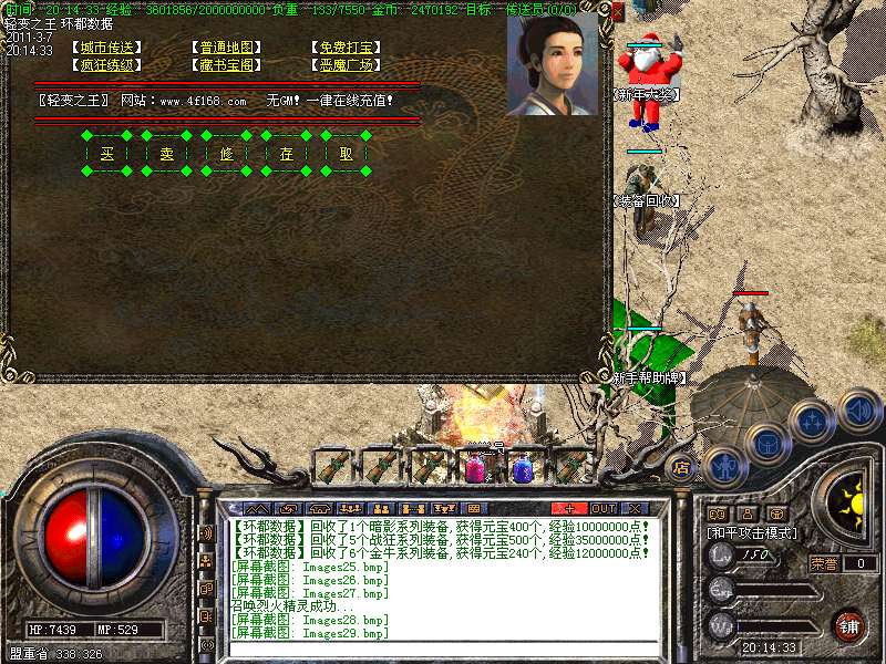 八.【特殊刷新】用魔法神石在土药旁边的魔法结阵可召唤出蚩尤.同时可获得丰富的奖品.--即本服的所有装备都可送出!