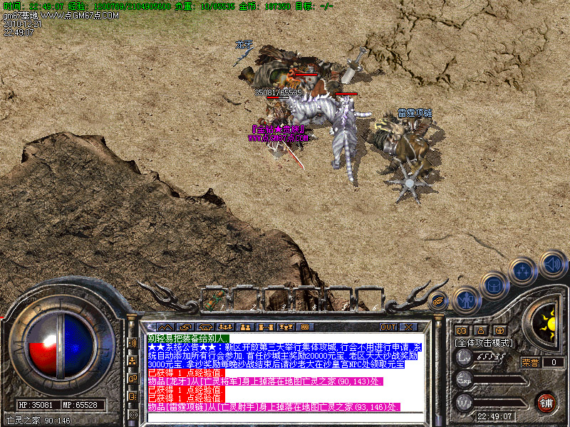★★系统公告★★:新区开放第三天举行集体攻城,行会不用进行申请,系统自动添加所有行会参加.首任沙城主奖励20000元宝.老区天天沙战奖励3000元宝.拿沙奖励每晚沙战结束后请沙老大在沙皇宫NPC处领取元宝