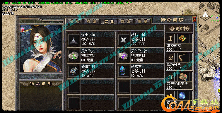 增加装备加星系统,提高装备的自身属性,让玩家有更深一层的追求,不会拥有一套终极装备而无趣.装备可以提升到5星属性,砸星的材料可以在商铺购买.