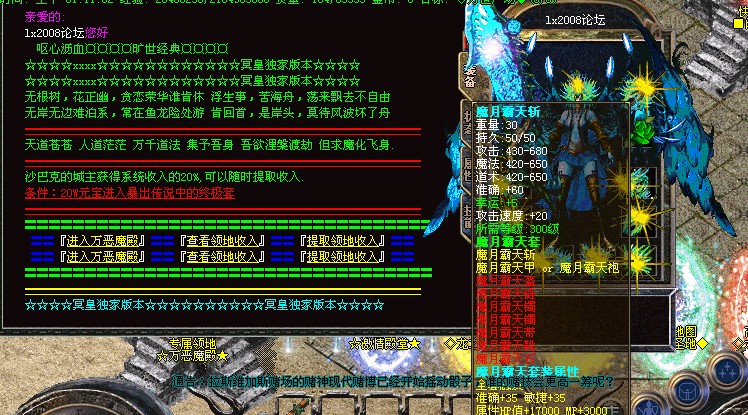 【更新】新增地图【材料王国】打材料,打元宝的好地方!【恶鬼巢穴】【水域领地】【魔族冥界】【万世广场】【雅戈星宫】【亡灵圣地】【遗失龙城】【幽千山谷】【灵界天宫】【魔王天寨】【万恶魔殿】所有地图都均由相应的装备!!想要好装备就得靠自己努力的寻找.注意:BOSS能报终极装备,怪物强悍凶猛.建议组队前往