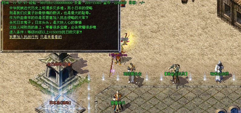 22.抗日战场,进入等级需要85级,里面怪物刷新快,爆率高,装备好,想获得好装备的。是你的必进之地!【此地图最新添加人形怪,主宰,必杀,元宝爆率超高】