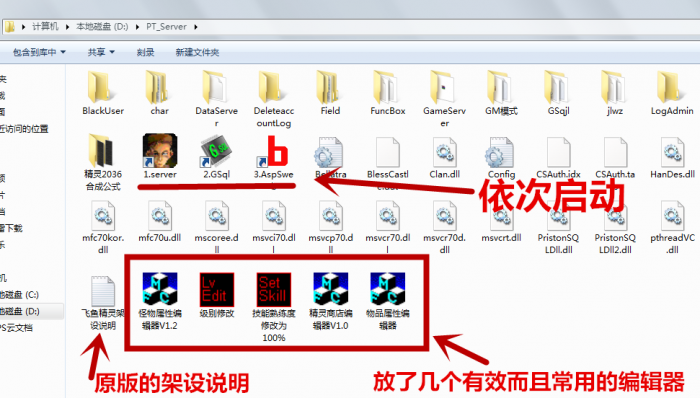 精灵2036一键安装版+大量工具+客户端架设步骤:1.把服务端解压至D盘(文件夹不能有任何中文路径)例如:D:\PT_Server2.把客户端解压到任意盘,文件名任意3.把解压出来的精灵客户端种char和field两个