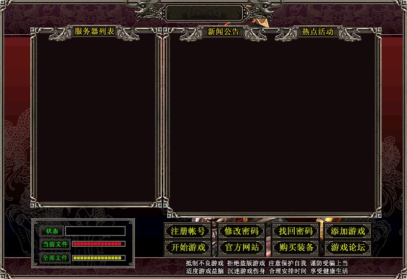 v2.0完成了逐鹿版本的全部的功能内核采用逐鹿最新引擎。支持所有逐鹿传奇改写了反外挂内核加入了窗口登录模式加入了内置外挂*v1.0基本完成了登录界面完成了内核状态