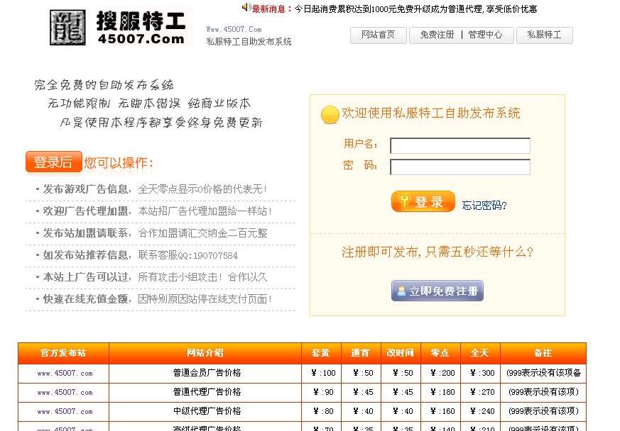 在次声明:以上功能全部开放使用,没有做任何限制,也没有任何限制收费使用,请大家放心使用,你在使用本程序的过程中,我们将终身为你免费提供更新,我们发布新版本在你的后台官方版本号会有所改变,如果你正使用的版本号和官方版本号不同,那么就需要更新,请登陆到我们的网站,www.45007.com 下载更新程序,以及更新日志.