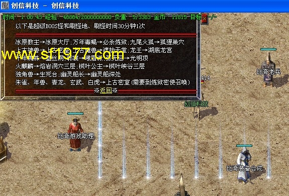 公告:高级装备攻略→上古合成(比奇城)→上古镶嵌(白日门)→2转装备(终极炼狱最后一层),每天中午12点30分举行年兽BOOS攻城,有几率爆出新技能