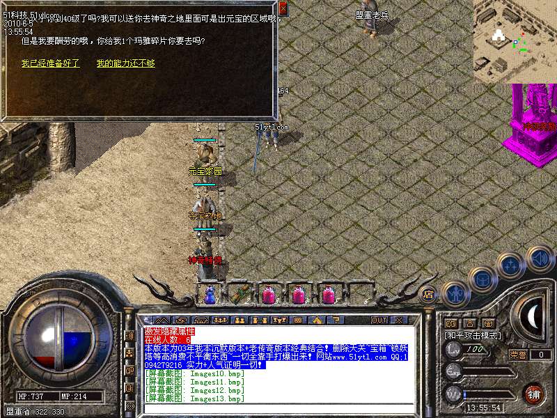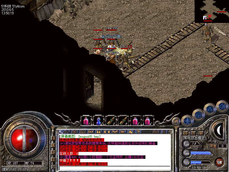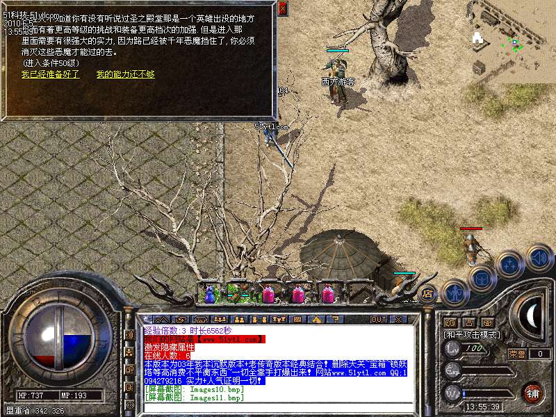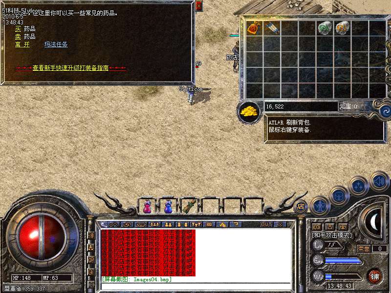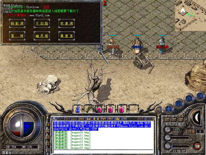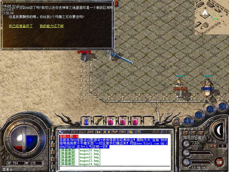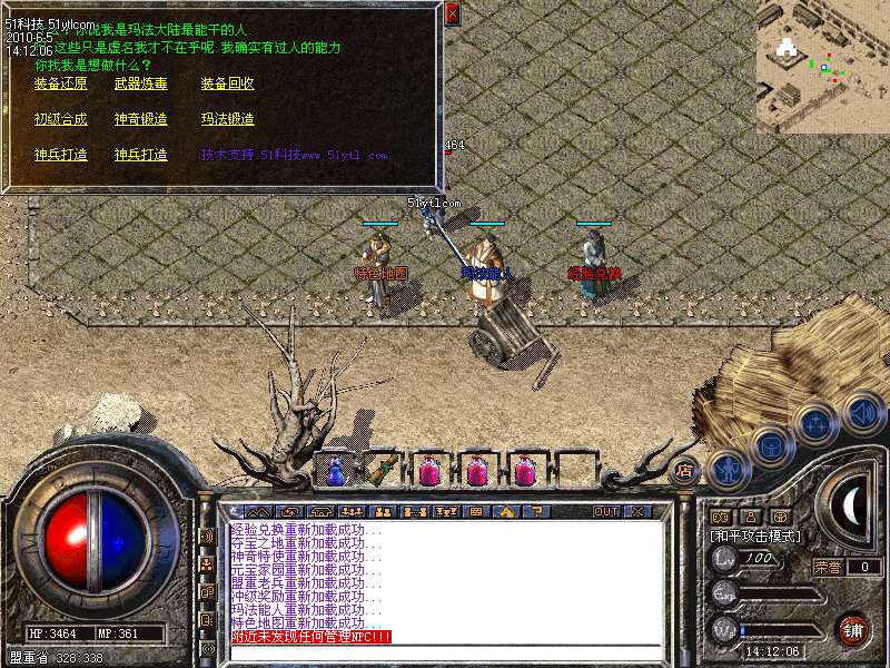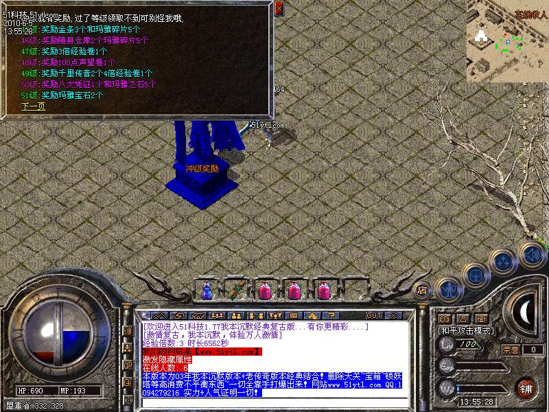 (*)重不归路可以进入僻世森林,神奇之地可以进入绝望和地下魔宫都是出46级以上装备的地方,土右上的西方游客可以进入麒麟洞和地狱之牢可以打出49以上装备。