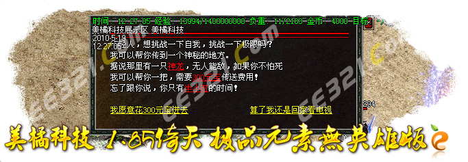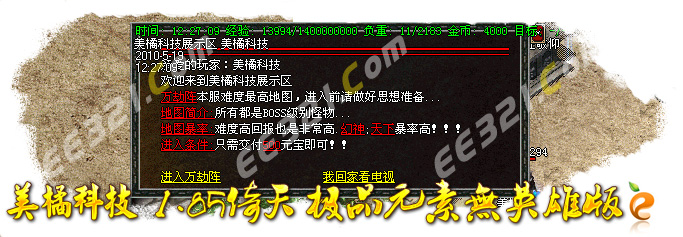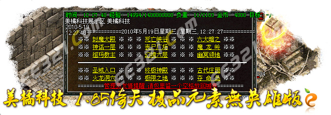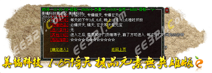 [56]特别提示:在每天的下午3点,6点,晚上10点,12点会开放武器专爆地图!必爆开天,镇天和玄天一把和天龙刀!进入地图需要赌筛子才可以进入!具体情况自己去体验!