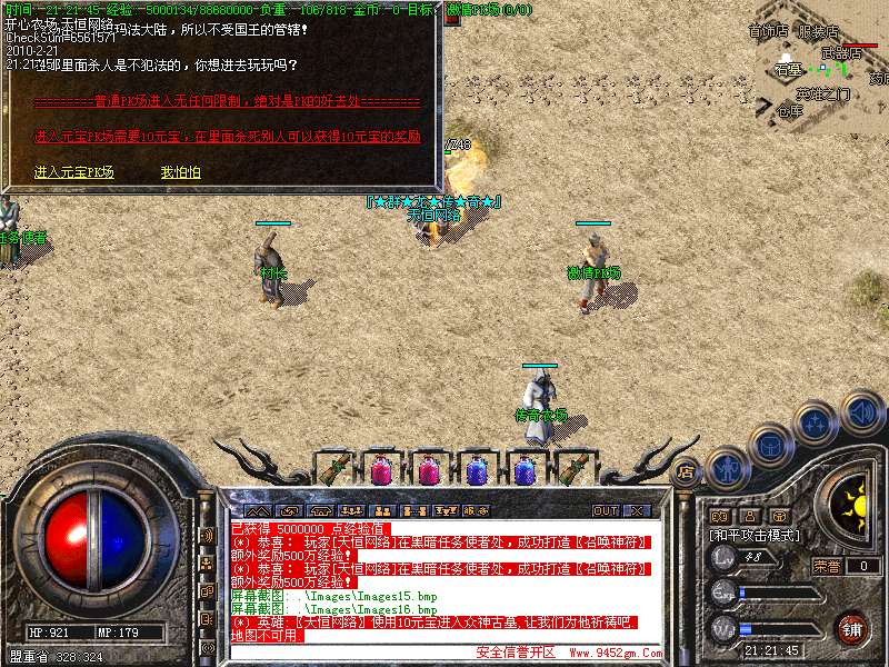10;元宝PK场;玛法大陆是受法律保护,杀人是要红名,PK场由于远离玛法大陆,所以不受法律的制裁.在里面杀死别人可以获得10元宝的奖励。
