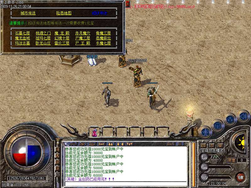 元宝充值:元宝短信比例1:15000 神州行充值卡送20%、骏网一卡通、盛大游戏点卡送20%、征途游戏卡、久游一卡通送20%、QB卡送20%、网上银行及财富通送40%、点卡充值请登陆官方网站进行充值!