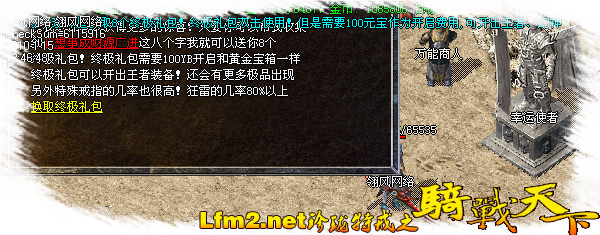 1、新增加终极礼包!在你开黄金宝箱过程中可能得到[心想事成财源广进]这8个字,只要你收集到这8个字可以到土城游戏助理那里换取8个终极礼包!终极礼包双击使用!但是需要100元宝作为开启费用,可开出王者、幻神装备,及五大神戒!