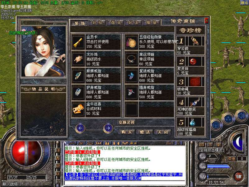 【神的恩赐系统】玩家可以在元宝商店使用获得<神的恩赐>,短暂的时间内激发自身潜能力量.增加人物死亡提示地图.坐标.方便丢了装备的快速找到该地点.